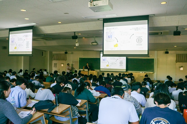 10月17日(金)、商学部「経営倫理学(担当:吉野直人教授)」の授業において、えそらフォレスト株式会社より、代表取締役社長・細田洋平氏、HANA ORGANIC事業部CMO・赤間俊祐氏、管理チームB Corp担当・吉田元美氏の3名を招き、「B Corp認証取得の軌跡」をテーマに特別講演会が行われ、約170名の学生が出席しました。
