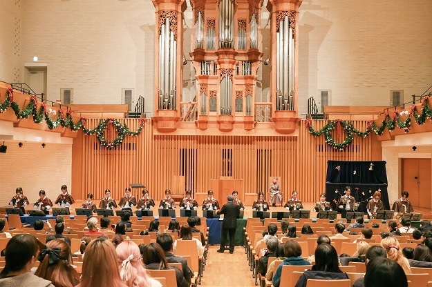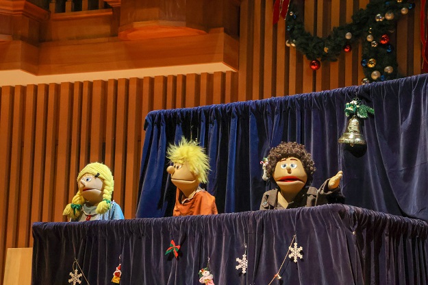 式典では、ハンドベルクワイアのハンドベル演奏、チャペルクワイアの合唱の後、今回初めて人形劇団「ゴスペルアクターズ」による人形劇も実施されました。その後、来場者はチャペル前広場に移動し、チャペル横の大きな糸杉に灯る瞬間を見守りました。イエス・キリストという希望の光がこの世に灯された時と同じように、ツリーを見上げる参加者の顔には優しい微笑みに溢れていました。