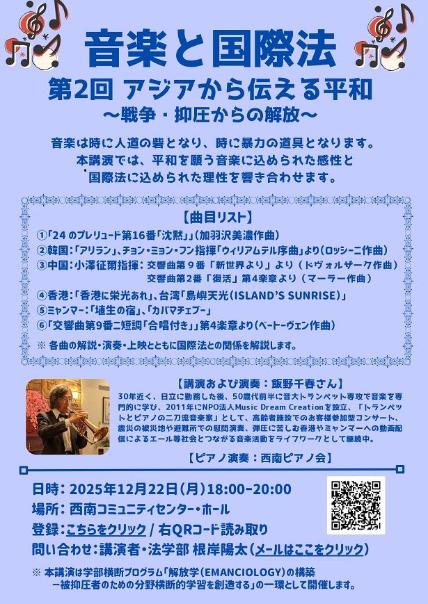 ※各曲の解説・演奏・上映とともに国際法との関係を解説します(法学部教授:根岸)