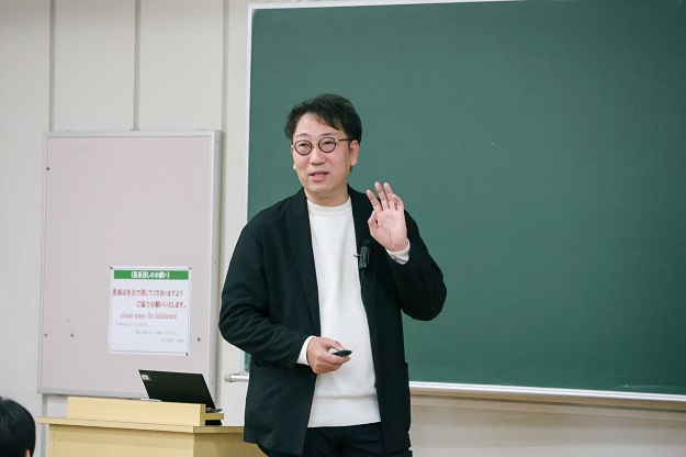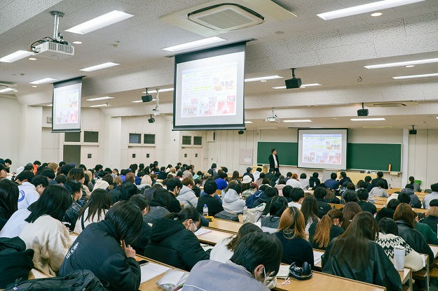 12月4日(木)、商学部「貿易論(担当:藤川昇悟教授)」の授業において、イオン九州株式会社食品商品部より、正木伴征氏をお招きし、「商品開発から生まれる価値創造-グローバル調達編-」と題した特別講演が行われ、約200名の学生が出席しました。