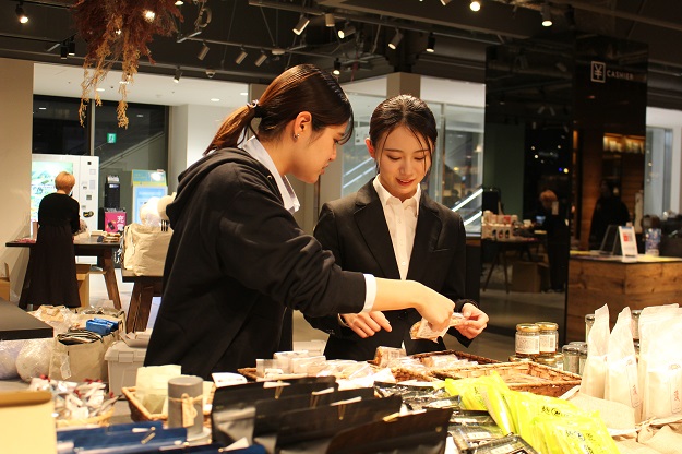 本プロジェクトに携わった高野日向さん(商・経3年)は、「地域の特産品や観光地を調査し、ほかの班や関係者の方々と連携しながら、うきは市の魅力を直感的に伝えられる見せ方を目指して取り組んだ。限られた時間の中で、班内の意見調整に苦労したが、何度も話し合いを重ねる中でより良いものにできた。今回の経験から、“誰かに伝える面白さ”を実感するとともに、アイデアを形にすることや、仲間と意見を出し合いながら1つの成果物を作り上げる過程を学んだ」とコメントしました。また、山岡浬世さん(商・経2年)は、「ターゲット層を決める過程が特に難しく、ターゲティングの手法は授業で学んでいたものの、実際に売り場づくりを行うとなるとどこから手を付けたらよいか分からず困ったが、先生のご指導もあり、六本松では“ギフト”を軸にしたコンセプトに無事に決まった。働く人の想いや仕事への熱意に触れ、授業での学びを実際の販売経験に生かす経験ができたことで、自身の将来の働き方を想像する大きなきっかけになった」とプロジェクト中の苦労や学びを語りました。