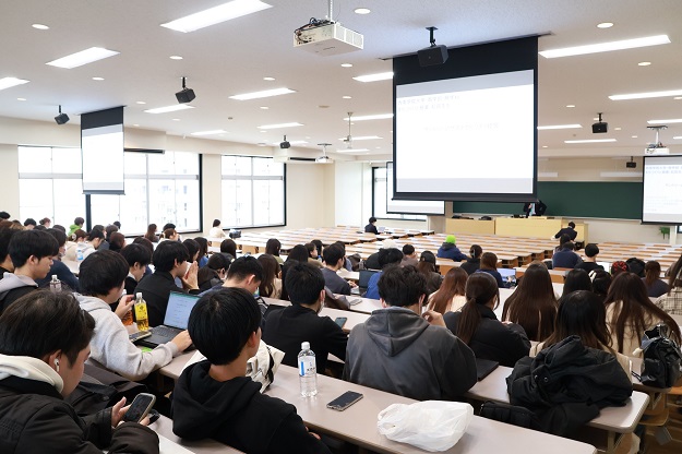 12月11日(木)、商学部「まちづくりと商業(担当:松田温郎教授)」の授業において、サントリーホールディングス株式会社サステナビリティ経営推進本部より北村暢康氏をお招きし、「サントリーのサステナビリティ経営」と題した特別講演が行われ、約230名の学生が出席しました。