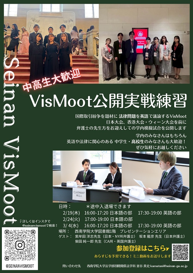 国際取引紛争を題材に法律問題を英語で議論する「Seinan Vis Moot」チームは、日本大会、香港大会・ウィーン大会を前に弁護士の先生方をお迎えしての学内模擬試合を公開します。